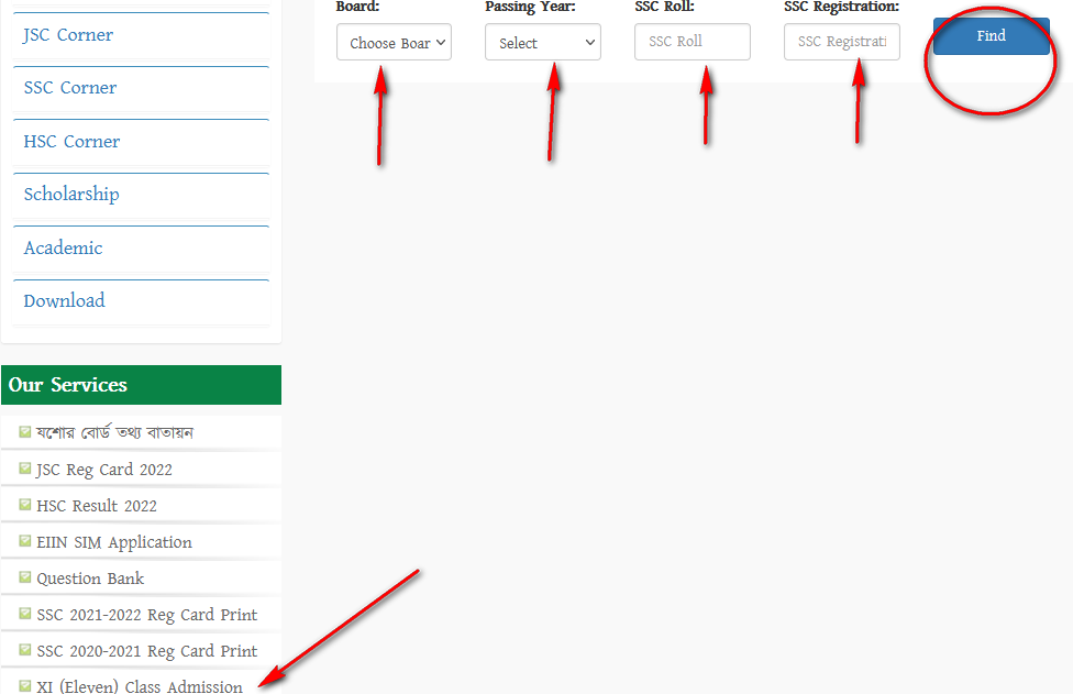 ২। যশোর বোর্ডের ওয়েবসাইটের বাম দিকে "Our Services" অংশের "XI (Eleven ) Class Admission" মেনু থেকে অনলাইনে ভর্তির জন্য ০৫ (পাঁচ) টি কলেজ উচ্চ মাধ্যমিক বিদ্যালয় পছন্দক্রম অনুসারে নির্বাচন করে আবেদন দাখিল করতে পারবে